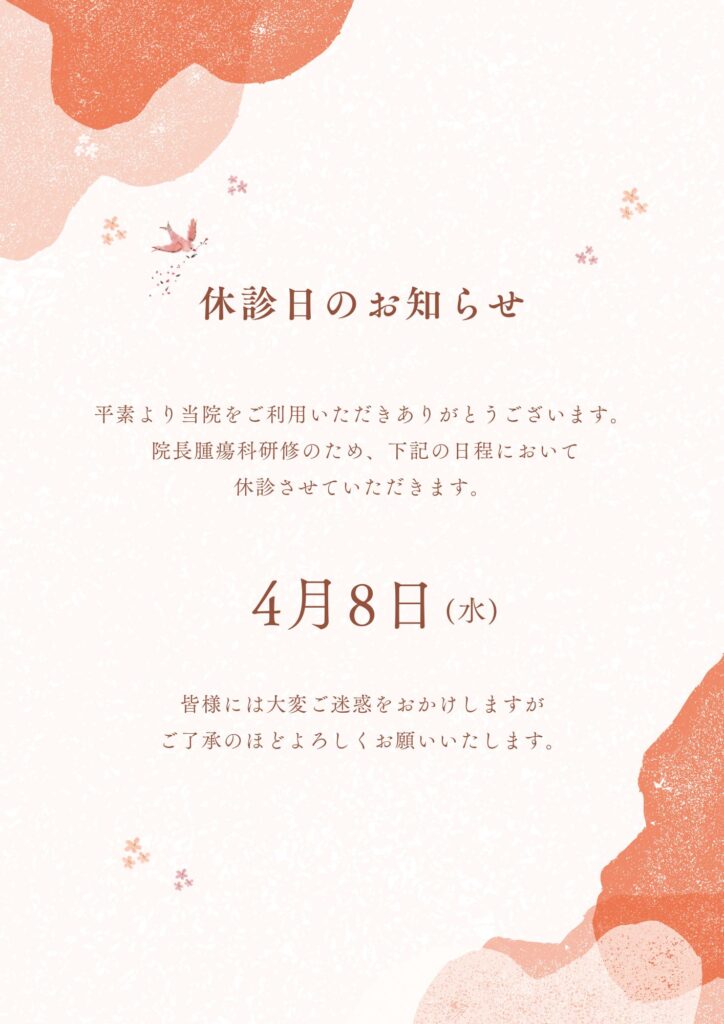 休診日のお知らせ お知らせ 2026年3月20日 平素より当院をご利用いただきありがとうございます。先日ご案内いたしました休診日につきまして、4月は第1水曜日ではなく第2水曜日が休診となります。ご迷惑をおかけしますが、何卒よろしくお願いいたします。