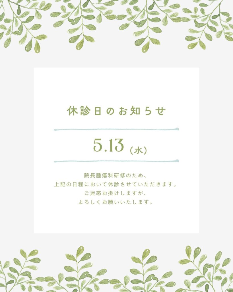 休診日のお知らせ お知らせ 2026年4月10日 平素より当院をご利用いただきありがとうございます。先日ご案内いたしました休診日につきまして、5月は第1水曜日ではなく第2水曜日が休診となります。ご迷惑をおかけしますが、何卒よろしくお願いいたします。